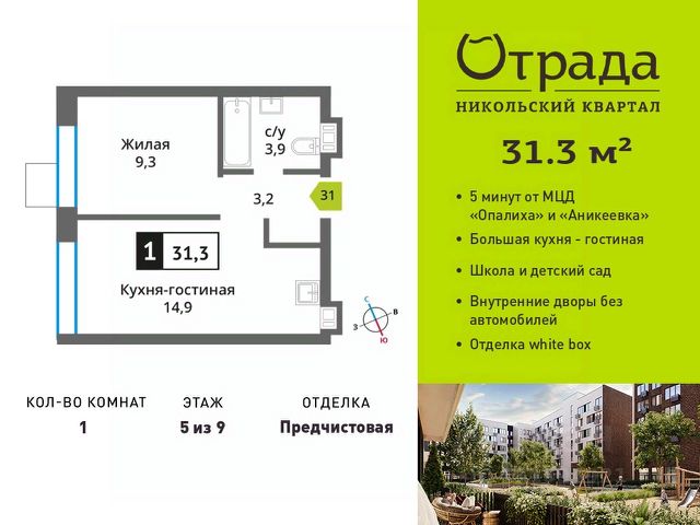 Однокомнатная квартира (евродвушка) с просторной кухней-гостиной Однокомнатная квартира (евродвушка) с просторной кухней-гостиной в жилом комплексе комфорт-класса "Никольский квартал Отрада". Планировка выполнена по современным стандартам и отличается повышенным комфортом. Квартал расположен в удачной локации, которая сочетает благоприятную экологическую обстановку с прекрасной транспортной доступностью. Проектом предусмотрены 14 корпусов высотой 6-9 этажей, а также муниципальная школа, один муниципальный и один частный детский сад, два наземных многоуровневых паркинга с кладовыми помещениями. Надежный застройщик ГК "Отрада" с высочайшим рейтингом 5 звезд от портала ЕРЗ. Все корпуса во всех ЖК сданы раньше срока! Купить квартиру площадью примерно 30 м2 (кв.м.) в Красногорске.