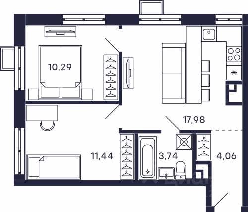 Это полноценная двушка (не евро-двушка), с очень удачной планировкой, с двумя отдельными изолированными комнатами и кухней. Общая площадь 49,4 м2. Комнаты 11,24 и 11,01 м2, кухня 10,46 м2.