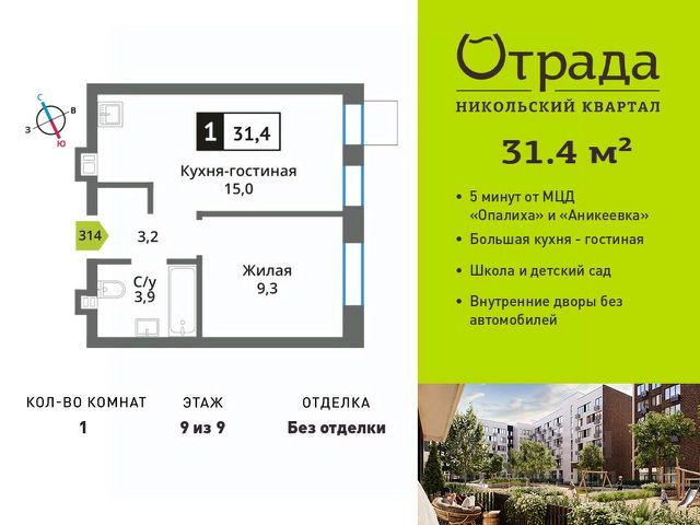 Однокомнатная квартира (евродвушка) с просторной кухней-гостиной Однокомнатная квартира (евродвушка) с просторной кухней-гостиной в жилом комплексе комфорт-класса "Никольский квартал Отрада". Планировка выполнена по современным стандартам и отличается повышенным комфортом. Квартал расположен в удачной локации, которая сочетает благоприятную экологическую обстановку с прекрасной транспортной доступностью. Проектом предусмотрены 14 корпусов высотой 6-9 этажей, а также муниципальная школа, один муниципальный и один частный детский сад, два наземных многоуровневых паркинга с кладовыми помещениями. Надежный застройщик ГК "Отрада" с высочайшим рейтингом 5 звезд от портала ЕРЗ. Все корпуса во всех ЖК сданы раньше срока! Квартира до 7 млн. рублей в Красногорске.