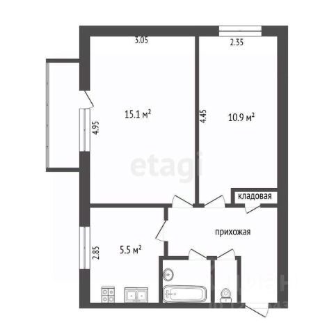 Структура комнат: 9.15 + 14.7 + 10.31 м²