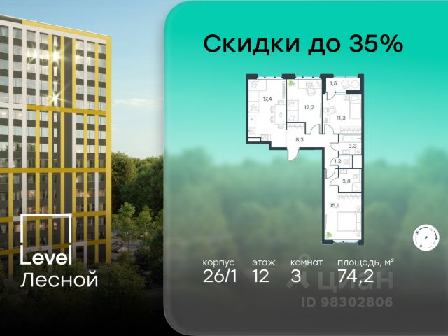 Цена указана с учётом скидки при 100%-й оплате, несубсидированной ипотеке, рассрочке (кроме программы "Рассрочка 0%"). В районе, утопающем в густой зелени лесов, многочисленных парков и скверов, продаётся 3-комнатная квартира площадью 82.30 кв.м с отделкой white box. Квартира расположена на 12 этаже в жилом комплексе комфорт-класса Level Лесной (компания Level Group/Левел групп). Отличная транспортная доступность: - 25 мин. пешком до станции метро "Пятницкое шоссе"; - 28 мин. на автобусе до станции метро и МЦД-2 "Волоколамская"; - 11 мин. на авто до МКАД; - 25 мин. на авто до ТТК. Продуманный архитектурный проект: - Концепция проекта Level Лесной от бюро СПИЧ; - Высотность комплекса до 15 этажей с уникальными видами на лесные массивы и город; - Высота потолков до 3 м; - Современные окна высотой до 1,6 м, в части квартир предусмотрены окна в пол. Высота подоконников 0,6 м; Расположение: Level Лесной строится в зелёной зоне ближайшего Подмосковья, г.о. Красногорск в посёлке Отрадное. Шаговая и автомобильная доступность до метро и больших транспортных артерий города. За 25 минут вы дойдёте до станции метро "Пятницкое шоссе", а за 20 минут на машине сможете доехать до станции метро "Тушинская". Район окружен роскошной зеленью лесов и парковых зон, занимающих территорию свыше 1 000 гектаров. Помимо благоприятной экологии, здесь множество возможностей для активного отдыха и поддержания физической формы. Облагороженная территории с полностью развитой инфраструктурой. На территории проекта находится детский сад и школа "Светлые Горы", которая входит в список лучших частных школ от Forbes Education (по данным на 2023г.). Кроме того, в пешей доступности расположено ещё 8 детских садов, а также запланировано открытие современной муниципальной школы. В непосредственной близости находятся сетевые супермаркеты и локальные магазины, аптеки, клиники, почта, библиотека, салоны красоты, рестораны, спортивные и творческие секции, развивающие детские центры. В 12 минутах пешком расположен торговый парк "Отрада" с продуктовым и строительным гипермаркетами, магазинами, кинотеатром и развлечениями для детей. Внутренняя инфраструктура: Мы знаем, как важно, чтобы магазины и сервисы были всегда рядом. В сданных корпусах Level Лесной уже расположена полностью готовая развитая инфраструктура. На первых этажах корпуса 27 предусмотрено ещё 14 коммерческих помещений. Благоустройство: Продуманное пространство и аура приватного европейского городка рождают чувство лёгкости и расслабления у каждого, кто попадает на территорию проекта. Концепцию общественных площадок разработали в партнёрстве два архитектурных бюро: Highlight Architecture и SCAPE. В безопасных дворах без машин каждый обязательно найдёт себе место для вдохновения, отдыха и спорта.