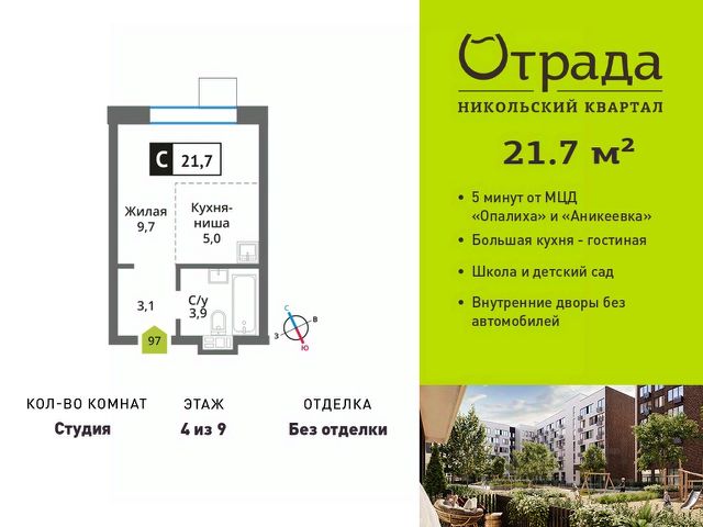Квартира-студия с компактной кухней-нишей Квартира-студия с компактной кухней-нишей в жилом комплексе комфорт-класса "Никольский квартал Отрада". Планировка выполнена по современным стандартам и отличается повышенным комфортом. Квартал расположен в удачной локации, которая сочетает благоприятную экологическую обстановку с прекрасной транспортной доступностью. Проектом предусмотрены 14 корпусов высотой 6-9 этажей, а также муниципальная школа, один муниципальный и один частный детский сад, два наземных многоуровневых паркинга с кладовыми помещениями. Надежный застройщик ГК "Отрада" с высочайшим рейтингом 5 звезд от портала ЕРЗ. Все корпуса во всех ЖК сданы раньше срока!