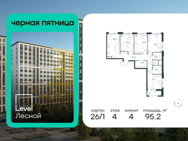Цена указана с учётом скидки при 100%-й оплате, несубсидированной ипотеке, рассрочке (кроме программы "Рассрочка 0%"). Субсидированная семейная ипотека. Полная стоимость кредита 20,963 - 23,237% годовых. Ставка 3,9% годовых. Первоначальный взнос от 20,01%. Сумма кредита до 12 млн. руб. В районе, утопающем в густой зелени лесов, многочисленных парков и скверов, продаётся 4-комнатная квартира площадью 95.20 кв.м с отделкой white box. Квартира расположена на 4 этаже в жилом комплексе комфорт-класса Level Лесной (компания Level Group/Левел групп). Отличная транспортная доступность: - 25 мин. пешком до станции метро "Пятницкое шоссе"; - 28 мин. на автобусе до станции метро и МЦД-2 "Волоколамская"; - 11 мин. на авто до МКАД; - 25 мин. на авто до ТТК. Продуманный архитектурный проект: - Концепция проекта Level Лесной от бюро СПИЧ; - Высотность комплекса до 15 этажей с уникальными видами на лесные массивы и город; - Высота потолков до 3 м; - Современные окна высотой до 1,6 м, в части квартир предусмотрены окна в пол. Высота подоконников 0,6 м; Расположение: Level Лесной строится в зелёной зоне ближайшего Подмосковья, г.о. Красногорск в посёлке Отрадное. Шаговая и автомобильная доступность до метро и больших транспортных артерий города. За 25 минут вы дойдёте до станции метро "Пятницкое шоссе", а за 20 минут на машине сможете доехать до станции метро "Тушинская". Район окружен роскошной зеленью лесов и парковых зон, занимающих территорию свыше 1 000 гектаров. Помимо благоприятной экологии, здесь множество возможностей для активного отдыха и поддержания физической формы. Облагороженная территории с полностью развитой инфраструктурой. На территории проекта находится детский сад и школа "Светлые Горы", которая входит в список лучших частных школ от Forbes Education (по данным на 2023г.). Кроме того, в пешей доступности расположено ещё 8 детских садов, а также запланировано открытие современной муниципальной школы. В непосредственной близости находятся сетевые супермаркеты и локальные магазины, аптеки, клиники, почта, библиотека, салоны красоты, рестораны, спортивные и творческие секции, развивающие детские центры. В 12 минутах пешком расположен торговый парк "Отрада" с продуктовым и строительным гипермаркетами, магазинами, кинотеатром и развлечениями для детей. Внутренняя инфраструктура: Мы знаем, как важно, чтобы магазины и сервисы были всегда рядом. В сданных корпусах Level Лесной уже расположена полностью готовая развитая инфраструктура. На первых этажах корпуса 27 предусмотрено ещё 14 коммерческих помещений. Благоустройство: Продуманное пространство и аура приватного европейского городка рождают чувство лёгкости и расслабления у каждого, кто попадает на территорию проекта. Концепцию общественных площадок разработали в партнёрстве два архитектурных бюро: Highlight Architecture и SCAPE. В безопасных дворах без машин каждый обязательно найдёт себе место для вдохновения, отдыха и спорта.