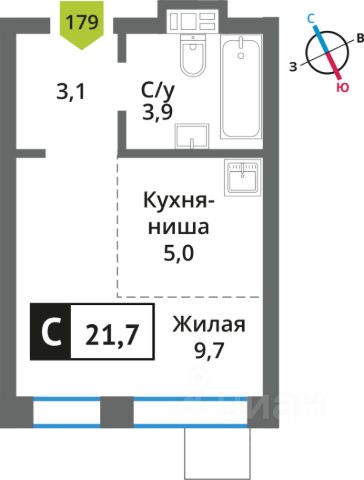 Общая площадь квартиры 40,8 кв.м. (с лоджией). Комната площадью 19,1 кв.м с выходом на лоджию, кухня - 9,7 кв.м, санузел совмещенный. Лоджия 6 кв.м, утеплена, оборудована местом для отдыха и хранения вещей.