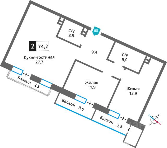 Продаётся 2-комнатная квартира в строящемся доме (Корпус 41), срок сдачи: II-кв. 2026, общей площадью 74.2 кв.м., на 3 этаже. Новый жилой комплекс "Отрада на реке" от Застройщика Отрада Девелопмент