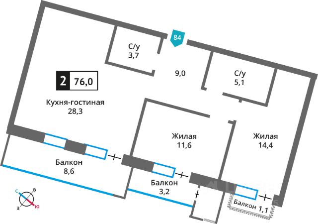 Продаётся 2-комнатная квартира в строящемся доме (Корпус 41), срок сдачи: II-кв. 2026, общей площадью 76 кв.м., на 2 этаже. Новый жилой комплекс "Отрада на реке" от Застройщика Отрада Девелопмент