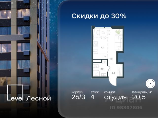 Цена указана с учётом скидки при 100%-й оплате, несубсидированной ипотеке, рассрочке (кроме программы "Рассрочка 0%"). В районе, утопающем в густой зелени лесов, многочисленных парков и скверов, продаётся студия площадью 20.50 кв.м без отделки. Квартира расположена на 4 этаже в жилом комплексе комфорт-класса Level Лесной (компания Level Group/Левел групп). Отличная транспортная доступность: - 25 мин. пешком до станции метро "Пятницкое шоссе"; - 28 мин. на автобусе до станции метро и МЦД-2 "Волоколамская"; - 11 мин. на авто до МКАД; - 25 мин. на авто до ТТК. Продуманный архитектурный проект: - Концепция проекта Level Лесной от бюро СПИЧ; - Высотность комплекса до 15 этажей с уникальными видами на лесные массивы и город; - Высота потолков до 3 м; - Современные окна высотой до 1,6 м, в части квартир предусмотрены окна в пол. Высота подоконников 0,6 м; Расположение: Level Лесной строится в зелёной зоне ближайшего Подмосковья, г.о. Красногорск в посёлке Отрадное. Шаговая и автомобильная доступность до метро и больших транспортных артерий города. За 25 минут вы дойдёте до станции метро "Пятницкое шоссе", а за 20 минут на машине сможете доехать до станции метро "Тушинская". Район окружен роскошной зеленью лесов и парковых зон, занимающих территорию свыше 1 000 гектаров. Помимо благоприятной экологии, здесь множество возможностей для активного отдыха и поддержания физической формы. Облагороженная территории с полностью развитой инфраструктурой. На территории проекта находится детский сад и школа "Светлые Горы", которая входит в список лучших частных школ от Forbes Education (по данным на 2023г.). Кроме того, в пешей доступности расположено ещё 8 детских садов, а также запланировано открытие современной муниципальной школы. В непосредственной близости находятся сетевые супермаркеты и локальные магазины, аптеки, клиники, почта, библиотека, салоны красоты, рестораны, спортивные и творческие секции, развивающие детские центры. В 12 минутах пешком расположен торговый парк "Отрада" с продуктовым и строительным гипермаркетами, магазинами, кинотеатром и развлечениями для детей. Внутренняя инфраструктура: Мы знаем, как важно, чтобы магазины и сервисы были всегда рядом. В сданных корпусах Level Лесной уже расположена полностью готовая развитая инфраструктура. На первых этажах корпуса 27 предусмотрено ещё 14 коммерческих помещений. Благоустройство: Продуманное пространство и аура приватного европейского городка рождают чувство лёгкости и расслабления у каждого, кто попадает на территорию проекта. Концепцию общественных площадок разработали в партнёрстве два архитектурных бюро: Highlight Architecture и SCAPE. В безопасных дворах без машин каждый обязательно найдёт себе место для вдохновения, отдыха и спорта.