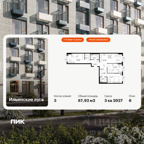 Продаётся квартира-студия площадью 24,6 кв.м на 4 этаже 9 этажного дома (Корпус 4.3, Секция 2) проекта ПИК Ильинские луга. Светлый просторный подъезд на уровне земли, функциональная планировка, большие окна, предчистовая отделка. Жилой район "Ильинские луга" находится в 10 километрах от МКАД по Новорижскому шоссе, в 20 минутах на автомобиле от станций метро "Волоколамская", "Тушинская" и "Строгино". В будущем ближе к проекту, в 9 минутах пути на машине, откроется станция "Ильинская" Рублёво-Архангельской линии, которая будет соединять Арбатско-Покровскую линию и Большую кольцевую линию. Сейчас в квартале начались продажи в корпусах 3.2, 3.3, 3.4, 3.5 и 3.6. "Ильинские луга" — масштабный проект, в который входит девять детских садов, четыре школы и поликлиника. Он строится в престижном и экологичном районе среди лесов и памятников природы. За 5 минут от жилого квартала можно доехать до Рублёво-Успенского шоссе, а за 30 минут — до центра Москвы. До крупного торгового центра "РИГАМОЛЛ" всего 5 минут на автомобиле, а до ТЦ "Твой дом" и гипермаркета "Глобус" — 10 минут. В "Ильинских лугах" строятся только девятиэтажные дома — такая архитектура соответствует спокойной жизни за городом. В каждом дворе-парке есть места для отдыха, детские и спортивные площадки. А ещё, здесь уже открыт большой PlayHub "Гравити" — современное игровое пространство с космической тематикой, холмами, зонами для игр и отдыха жителей любого возраста. На первых этажах уже работают магазины, кафе и пекарни. Места для отдыха от "Ильинских лугов" тоже недалеко: 10 минут на машине — и вы в музее-усадьбе "Архангельское". Также рядом находится Лохин остров — памятник природы, где водятся речные черепахи, есть места для кемпинга и возможность сплавиться по реке. Артикул 1011896 (Застройщик ООО "СЗ "ГРАДОЛИМП")