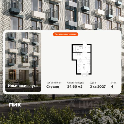 Продаётся квартира-студия площадью 24,6 кв.м на 4 этаже 9 этажного дома (Корпус 4.3, Секция 2) проекта ПИК Ильинские луга. Светлый просторный подъезд на уровне земли, функциональная планировка, большие окна, предчистовая отделка. Жилой район "Ильинские луга" находится в 10 километрах от МКАД по Новорижскому шоссе, в 20 минутах на автомобиле от станций метро "Волоколамская", "Тушинская" и "Строгино". В будущем ближе к проекту, в 9 минутах пути на машине, откроется станция "Ильинская" Рублёво-Архангельской линии, которая будет соединять Арбатско-Покровскую линию и Большую кольцевую линию. Сейчас в квартале начались продажи в корпусах 3.2, 3.3, 3.4, 3.5 и 3.6. "Ильинские луга" — масштабный проект, в который входит девять детских садов, четыре школы и поликлиника. Он строится в престижном и экологичном районе среди лесов и памятников природы. За 5 минут от жилого квартала можно доехать до Рублёво-Успенского шоссе, а за 30 минут — до центра Москвы. До крупного торгового центра "РИГАМОЛЛ" всего 5 минут на автомобиле, а до ТЦ "Твой дом" и гипермаркета "Глобус" — 10 минут. В "Ильинских лугах" строятся только девятиэтажные дома — такая архитектура соответствует спокойной жизни за городом. В каждом дворе-парке есть места для отдыха, детские и спортивные площадки. А ещё, здесь уже открыт большой PlayHub "Гравити" — современное игровое пространство с космической тематикой, холмами, зонами для игр и отдыха жителей любого возраста. На первых этажах уже работают магазины, кафе и пекарни. Места для отдыха от "Ильинских лугов" тоже недалеко: 10 минут на машине — и вы в музее-усадьбе "Архангельское". Также рядом находится Лохин остров — памятник природы, где водятся речные черепахи, есть места для кемпинга и возможность сплавиться по реке. Артикул 1011896 (Застройщик ООО "СЗ "ГРАДОЛИМП")