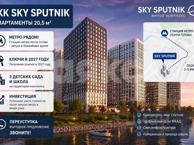 Арт. 132361627 Своё метро ,пляж, лесопарк. Студия с ремонтом в ЖК бизнескласса SkySputnik. Первая линия у Живописной бухты! Цена дешевле чем у застройщика . Продаются стильные апартаментыстудия 23,7 м² в современном комплексе SkySputnik (корпус 20). Сдача — IV квартал 2026 года. Переуступка, быстрый выход на сделку. Главные преимущества локации: "Из окон — вид на красивый зеленый двор, без шума улицы." Первая линия от Живописной бухты — прогулочные зоны, набережная, пляжи, зоны отдыха. 25 минут пешком до м. Строгино, удобный доступ к МКАД и ТТК. 10 минут пешком до будущей станции м. Липовая Роща (официальное открытие — 2027 год). Экологически чистый район: рядом Москварека, лесопарковые зоны, свежий воздух. Развитая инфраструктура района: школы и детские сады (включая частные), сетевые магазины и супермаркеты, аптеки, фитнесцентры, спортивные площадки, кафе и рестораны, зоны летнего отдыха и активности. Удобный выезд на Новорижское и Волоколамское шоссе. О комплексе SkySputnik: Современный ЖК комфорткласса с элементами бизнескласса. Архитектура в современном стиле, благоустроенные дворы без машин. Закрытая территория, видеонаблюдение, охрана. Подземный паркинг, колясочные, кладовые. Уже функционируют первые объекты инфраструктуры внутри комплекса. О квартире: Площадь: 23,7 м² Этаж: 2 Продуманная планировка: выделенная зона прихожей и кухни, удобное размещение мебели. Квартира сдаётся с качественным ремонтом от застройщика и установленной кухней! современные материалы, стильная отделка, кухонный гарнитур, готовность к проживанию или сдаче в аренду с первого дня. Идеально подходит: для жизни, для сдачи в аренду, как инвестиция (район активно развивается, рядом новая станция метро). Документы: Переуступка по ДДУ. Быстрый выход на сделку. Один собственник. Готов предоставить всю дополнительную информацию, фото, планировки и материалы по ремонту. Звоните в удобное время — отвечу на любые вопросы! Продается квартира в новостройке с отделкой в Красногорске.