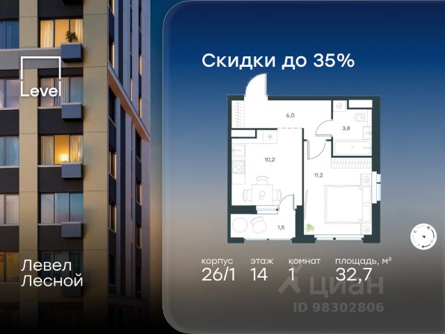 Цена указана с учётом скидки при 100%-й оплате, несубсидированной ипотеке, рассрочке (кроме программы "Рассрочка 0%"). В районе, утопающем в густой зелени лесов, многочисленных парков и скверов, продаётся 1-комнатная квартира площадью 32.70 кв.м с отделкой white box. Квартира расположена на 14 этаже в жилом комплексе комфорт-класса Левел Лесной (компания Level Group/Левел групп). Жилой квартал Левел Лесной расположен в посёлке Отрадное Красногорского района Московской области. Это уникальный природный уголок вблизи района Митино. Посёлок окружён обширными лесными массивами. Обилие зелени создаёт благоприятный экологический фон и превращает этот район в оазис спокойствия и единения с природой. Расположение и инфраструктура: - Район окружен роскошной зеленью лесов и парковых зон, занимающих территорию свыше 1 000 гектаров, среди них лесопарк внутри жилого комплекса, загородный парк "Отрада", Митинский лесопарк, набережная реки Синички. - Идеальные условия для активного отдыха в любое время года: пешие и велопрогулки, бег, зимой - лыжи и катание на ватрушках. - На территории ЖК - частная школа "Светлые Горы", входящая в топ лучших школ Москвы и Подмосковья (Forbes Education, 2023), и детский сад, в пешей доступности расположены 9 детских садов. - На территории жилого комплекса - сетевые супермаркеты, локальные магазины, аптеки, салоны красоты, рестораны и другие объекты инфраструктуры в сданных корпусах. В 12 мин. пешком - крупный торговый парк "Отрада" с гипермаркетами, кинотеатром и детскими развлечениями. Отличная транспортная доступность: - 25 мин. пешком до станции метро "Пятницкое шоссе"; - 28 мин. на автобусе до станции метро и МЦД-2 "Волоколамская"; - 11 мин. на авто до МКАД; - 25 мин. на авто до ТТК. Продуманный архитектурный проект: - Концепция проекта Левел Лесной разработана бюро СПИЧ; - Высотность комплекса до 15 этажей с уникальными видами на лесные массивы и город; - Высота потолков до 3 м; - Современные окна высотой до 1,6 м, в части квартир предусмотрены окна в пол. Высота подоконников 0,6 м. Благоустройство: Продуманное пространство и аура приватного европейского городка рождают чувство лёгкости и расслабления у каждого, кто попадает на территорию проекта. Концепцию общественных площадок разработали в партнёрстве два архитектурных бюро: Highlight Architecture и SCAPE. В безопасных дворах без машин каждый обязательно найдёт себе место для вдохновения, отдыха и спорта.
