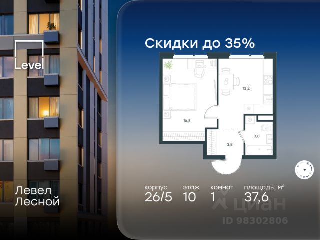 Цена указана с учётом скидки при 100%-й оплате, несубсидированной ипотеке, рассрочке (кроме программы "Рассрочка 0%"). В районе, утопающем в густой зелени лесов, многочисленных парков и скверов, продаётся 1-комнатная квартира площадью 37.60 кв.м с отделкой white box. Квартира расположена на 10 этаже в жилом комплексе комфорт-класса Левел Лесной (компания Level Group/Левел групп). Жилой квартал Левел Лесной расположен в посёлке Отрадное Красногорского района Московской области. Это уникальный природный уголок вблизи района Митино. Посёлок окружён обширными лесными массивами. Обилие зелени создаёт благоприятный экологический фон и превращает этот район в оазис спокойствия и единения с природой. Расположение и инфраструктура: - Район окружен роскошной зеленью лесов и парковых зон, занимающих территорию свыше 1 000 гектаров, среди них лесопарк внутри жилого комплекса, загородный парк "Отрада", Митинский лесопарк, набережная реки Синички. - Идеальные условия для активного отдыха в любое время года: пешие и велопрогулки, бег, зимой - лыжи и катание на ватрушках. - На территории ЖК - частная школа "Светлые Горы", входящая в топ лучших школ Москвы и Подмосковья (Forbes Education, 2023), и детский сад, в пешей доступности расположены 9 детских садов. - На территории жилого комплекса - сетевые супермаркеты, локальные магазины, аптеки, салоны красоты, рестораны и другие объекты инфраструктуры в сданных корпусах. В 12 мин. пешком - крупный торговый парк "Отрада" с гипермаркетами, кинотеатром и детскими развлечениями. Отличная транспортная доступность: - 25 мин. пешком до станции метро "Пятницкое шоссе"; - 28 мин. на автобусе до станции метро и МЦД-2 "Волоколамская"; - 11 мин. на авто до МКАД; - 25 мин. на авто до ТТК. Продуманный архитектурный проект: - Концепция проекта Левел Лесной разработана бюро СПИЧ; - Высотность комплекса до 15 этажей с уникальными видами на лесные массивы и город; - Высота потолков до 3 м; - Современные окна высотой до 1,6 м, в части квартир предусмотрены окна в пол. Высота подоконников 0,6 м. Благоустройство: Продуманное пространство и аура приватного европейского городка рождают чувство лёгкости и расслабления у каждого, кто попадает на территорию проекта. Концепцию общественных площадок разработали в партнёрстве два архитектурных бюро: Highlight Architecture и SCAPE. В безопасных дворах без машин каждый обязательно найдёт себе место для вдохновения, отдыха и спорта.