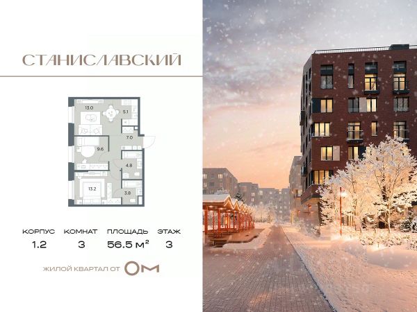 Цена указана с учетом скидки при 100% оплате В продаже 3-комнатная квартира площадью 58.1 м² на 4 этаже в жилом квартале "Станиславский" — проекте бизнес-класса на Новорижском шоссе, в 10 минутах от Москвы. В квартире 52 Дом 1 (Корпус 1.1, секция 2) высокие потолки (от 3 метров) и удобная планировка, а также балкон — место для утреннего кофе и вечернего отдыха. Квартира без отделки, что позволит реализовать в ней любые ваши планировочные и дизайнерские решения. "Станиславский" расположен в центре Поздняково и с трёх сторон окружён зелёными массивами. Камерная застройка, дизайнерские лобби и закрытая территория создают чувство приватности и безопасности. Внутри — сценарии для жизни и отдыха: прогулки по зелёным бульварам и природным тропам, занятия в спортивном кластере (воркаут-зона, игровое поле, скалодром, сезонный каток), семейные праздники и кинопросмотры под открытым небом в holiday-пространстве, познавательная зона с огородом для детей. Транспортная доступность: 500 м до выезда на Новорижское, 10 минут до МКАД; около 30 минут до метро "Тушинская" и "Строгино", МЦД "Павшино". Сдача дома — 4 кв. 2027.