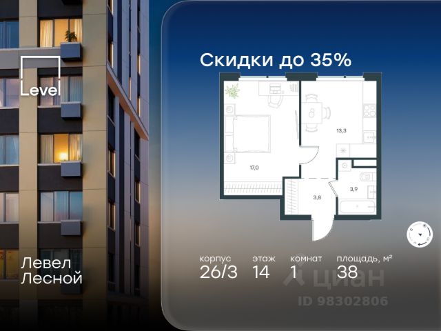 Цена указана с учётом скидки при 100%-й оплате, несубсидированной ипотеке, рассрочке (кроме программы "Рассрочка 0%"). В районе, утопающем в густой зелени лесов, многочисленных парков и скверов, продаётся 1-комнатная квартира площадью 38.00 кв.м без отделки. Квартира расположена на 14 этаже в жилом комплексе комфорт-класса Левел Лесной (компания Level Group/Левел групп). Отличная транспортная доступность: - 25 мин. пешком до станции метро "Пятницкое шоссе"; - 28 мин. на автобусе до станции метро и МЦД-2 "Волоколамская"; - 11 мин. на авто до МКАД; - 25 мин. на авто до ТТК. Продуманный архитектурный проект: - Концепция проекта Левел Лесной от бюро СПИЧ; - Высотность комплекса до 15 этажей с уникальными видами на лесные массивы и город; - Высота потолков до 3 м; - Современные окна высотой до 1,6 м, в части квартир предусмотрены окна в пол. Высота подоконников 0,6 м; Расположение: Жилой комплекс Левел Лесной строится в зелёной зоне ближайшего Подмосковья, г.о. Красногорск в посёлке Отрадное. Шаговая и автомобильная доступность до метро и больших транспортных артерий города. За 25 минут вы дойдёте до станции метро "Пятницкое шоссе", а за 20 минут на машине сможете доехать до станции метро "Тушинская". Район окружен роскошной зеленью лесов и парковых зон, занимающих территорию свыше 1 000 гектаров. Помимо благоприятной экологии, здесь множество возможностей для активного отдыха и поддержания физической формы. Облагороженная территории с полностью развитой инфраструктурой. На территории проекта находится детский сад и школа "Светлые Горы", которая входит в список лучших частных школ от Forbes Education (по данным на 2023г.). Кроме того, в пешей доступности расположено ещё 8 детских садов, а также запланировано открытие современной муниципальной школы. В непосредственной близости находятся сетевые супермаркеты и локальные магазины, аптеки, клиники, почта, библиотека, салоны красоты, рестораны, спортивные и творческие секции, развивающие детские центры. В 12 минутах пешком расположен торговый парк "Отрада" с продуктовым и строительным гипермаркетами, магазинами, кинотеатром и развлечениями для детей. Внутренняя инфраструктура: Мы знаем, как важно, чтобы магазины и сервисы были всегда рядом. В сданных корпусах жилого комплекса Левел Лесной уже расположена полностью готовая развитая инфраструктура. На первых этажах корпуса 27 предусмотрено ещё 14 коммерческих помещений. Благоустройство: Продуманное пространство и аура приватного европейского городка рождают чувство лёгкости и расслабления у каждого, кто попадает на территорию проекта. Концепцию общественных площадок разработали в партнёрстве два архитектурных бюро: "Хайлайт Архитектура" (Highlight Architecture) и "Скейп" (Scape). В безопасных дворах без машин каждый обязательно найдёт себе место для вдохновения, отдыха и спорта.
