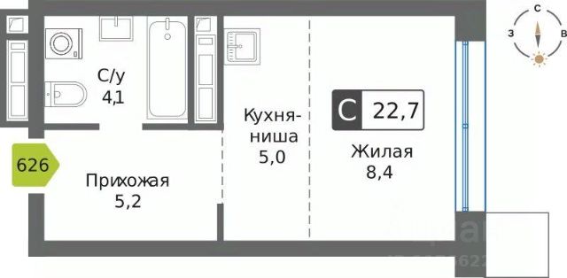 Продаётся студия 305, площадью 26,18 м², на 7 этаже в ЖК "Аникеевский" корпус 1.2. Стоимость — от 5909329 руб. Квартира без отделки, планировка односторонняя, окна во двор.