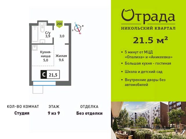 Продается студия 21,8 кв.м. расположенная на 6-ом этаже с прекрасным видом, высота потолков 3 м. Право собственности на основании ДДУ 1 собственник, мат капитал не использован при покупке , ДОМ СДАН Быстрый выход на сделку по ДКП. Никольский квартал Отрада новый жилой комплекс в Красногорске, в микрорайоне Опалиха. Квартал расположен в удачной локации, которая сочетает благоприятную экологическую обстановку с прекрасной транспортной доступностью. До МЦД "Опалиха" и "Аникеевка" можно будет добраться на автомобиле всего за 4-5 минут. Проектом предусмотрены 14 корпусов средней этажности 6-9 этажей, а также муниципальная школа, один муниципальный и один частный детский сад, два наземных многоуровневых паркинга с кладовыми помещениями. Все планировки выполнены по современным стандартам и отличаются повышенным комфортом. Для самых требовательных клиентов в проекте есть квартиры формата Лаунж Флэт с потолками до 3,9 м. и собственными террасами-патио.