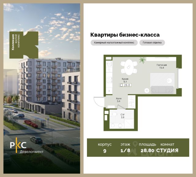 Агентам не звонить. Продается уютная студия на 1 этаже от застройщика. Общая площадь 28,4 кв.м. На выбор представлены 3 вида дизайнерской отделки с использованием качественных материалов. Высота потолков 3 м. "Коллекция" это камерный малоэтажный жилой комплекс бизнес-класса в престижном экологически чистом районе Подмосковья. Прекрасная экология и живописная природа, отсутствие промышленных зон и вредных предприятий. В проекте планируется строительство 5 корпусов средней этажностью (4-8 этажей) с террасами и угловыми окнами, строительство собственной инфраструктуры: три детских сада, школа, поликлиника, физкультурно-оздоровительный комплекс. Жителям будут доступны машино-места в подземном паркинге, кладовые помещения. Ввод в эксплуатацию 3 кв. 2028г. Развитая инфраструктура: Детские площадки будут выполнены в природных материалах, игровые комплексы с бизибордами, развивающие игровые установки для игр с песком. Спортивная инфраструктура: столы для настольного тенниса, тренажеры, гимнастический комплекс. В пешей доступности находятся парк Дружба, загородный клуб "Moscow Country Club", парк имени Карбышева. Это располагает к приятным прогулкам и спокойному отдыху жителей комплекса. Транспортная доступность: 13 км от МКАД, 14 минут до МЦД-2 Нахабино, 26 минут до метро "Митино", 30 минут до метро "Пятницкое шоссе". В ближайшей перспективе - расширение местной дорожной сети и запуск новых маршрутов до ж/д станций и станций метро.