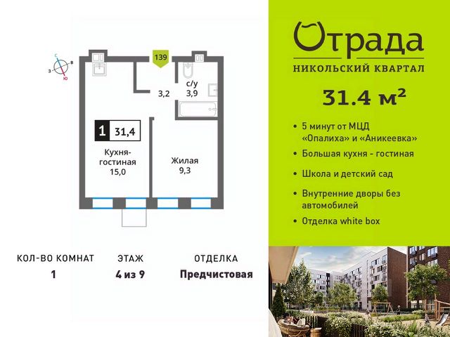 Однокомнатная квартира (евродвушка) с просторной кухней-гостиной Однокомнатная квартира (евродвушка) с просторной кухней-гостиной в жилом комплексе комфорт-класса "Никольский квартал Отрада". Планировка выполнена по современным стандартам и отличается повышенным комфортом. Квартал расположен в удачной локации, которая сочетает благоприятную экологическую обстановку с прекрасной транспортной доступностью. Проектом предусмотрены 14 корпусов высотой 6-9 этажей, а также муниципальная школа, один муниципальный и один частный детский сад, два наземных многоуровневых паркинга с кладовыми помещениями. Надежный застройщик ГК "Отрада" с высочайшим рейтингом 5 звезд от портала ЕРЗ. Все корпуса во всех ЖК сданы раньше срока!