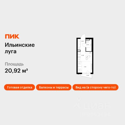 Продаётся квартира-студия площадью 19,9 кв.м на 2 этаже 9 этажного дома (Корпус 3.5, Секция 5) проекта ПИК Ильинские луга. Светлый просторный подъезд на уровне земли, функциональная планировка, большие окна, c отделкой. Жилой район "Ильинские луга" находится в 10 километрах от МКАД по Новорижскому шоссе, в 20 минутах на автомобиле от станций метро "Волоколамская", "Тушинская" и "Строгино". В будущем ближе к проекту, в 9 минутах пути на машине, откроется станция "Ильинская" Рублёво-Архангельской линии, которая будет соединять Арбатско-Покровскую линию и Большую кольцевую линию. Сейчас в квартале начались продажи в корпусах 3.2, 3.3, 3.4, 3.5 и 3.6. "Ильинские луга" — масштабный проект, в который входит девять детских садов, четыре школы и поликлиника. Он строится в престижном и экологичном районе среди лесов и памятников природы. За 5 минут от жилого квартала можно доехать до Рублёво-Успенского шоссе, а за 30 минут — до центра Москвы. До крупного торгового центра "РИГАМОЛЛ" всего 5 минут на автомобиле, а до ТЦ "Твой дом" и гипермаркета "Глобус" — 10 минут. В "Ильинских лугах" строятся только девятиэтажные дома — такая архитектура соответствует спокойной жизни за городом. В каждом дворе-парке есть места для отдыха, детские и спортивные площадки. А ещё, здесь уже открыт большой PlayHub "Гравити" — современное игровое пространство с космической тематикой, холмами, зонами для игр и отдыха жителей любого возраста. На первых этажах уже работают магазины, кафе и пекарни. Места для отдыха от "Ильинских лугов" тоже недалеко: 10 минут на машине — и вы в музее-усадьбе "Архангельское". Также рядом находится Лохин остров — памятник природы, где водятся речные черепахи, есть места для кемпинга и возможность сплавиться по реке. Артикул 1001892 (Застройщик ООО "СЗ "ГРАДОЛИМП")