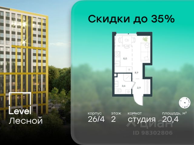 Цена указана с учётом скидки при 100%-й оплате, несубсидированной ипотеке, рассрочке (кроме программы "Рассрочка 0%"). В районе, утопающем в густой зелени лесов, многочисленных парков и скверов, продаётся студия площадью 21.80 кв.м без отделки. Квартира расположена на 2 этаже в жилом комплексе комфорт-класса Level Лесной (компания Level Group/Левел групп). Отличная транспортная доступность: - 25 мин. пешком до станции метро "Пятницкое шоссе"; - 28 мин. на автобусе до станции метро и МЦД-2 "Волоколамская"; - 11 мин. на авто до МКАД; - 25 мин. на авто до ТТК. Продуманный архитектурный проект: - Концепция проекта Level Лесной от бюро СПИЧ; - Высотность комплекса до 15 этажей с уникальными видами на лесные массивы и город; - Высота потолков до 3 м; - Современные окна высотой до 1,6 м, в части квартир предусмотрены окна в пол. Высота подоконников 0,6 м; Расположение: Level Лесной строится в зелёной зоне ближайшего Подмосковья, г.о. Красногорск в посёлке Отрадное. Шаговая и автомобильная доступность до метро и больших транспортных артерий города. За 25 минут вы дойдёте до станции метро "Пятницкое шоссе", а за 20 минут на машине сможете доехать до станции метро "Тушинская". Район окружен роскошной зеленью лесов и парковых зон, занимающих территорию свыше 1 000 гектаров. Помимо благоприятной экологии, здесь множество возможностей для активного отдыха и поддержания физической формы. Облагороженная территории с полностью развитой инфраструктурой. На территории проекта находится детский сад и школа "Светлые Горы", которая входит в список лучших частных школ от Forbes Education (по данным на 2023г.). Кроме того, в пешей доступности расположено ещё 8 детских садов, а также запланировано открытие современной муниципальной школы. В непосредственной близости находятся сетевые супермаркеты и локальные магазины, аптеки, клиники, почта, библиотека, салоны красоты, рестораны, спортивные и творческие секции, развивающие детские центры. В 12 минутах пешком расположен торговый парк "Отрада" с продуктовым и строительным гипермаркетами, магазинами, кинотеатром и развлечениями для детей. Внутренняя инфраструктура: Мы знаем, как важно, чтобы магазины и сервисы были всегда рядом. В сданных корпусах Level Лесной уже расположена полностью готовая развитая инфраструктура. На первых этажах корпуса 27 предусмотрено ещё 14 коммерческих помещений. Благоустройство: Продуманное пространство и аура приватного европейского городка рождают чувство лёгкости и расслабления у каждого, кто попадает на территорию проекта. Концепцию общественных площадок разработали в партнёрстве два архитектурных бюро: Highlight Architecture и SCAPE. В безопасных дворах без машин каждый обязательно найдёт себе место для вдохновения, отдыха и спорта.
