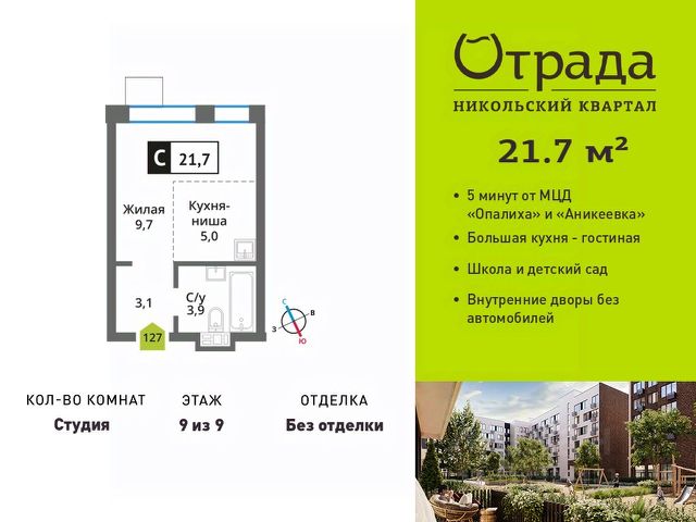Квартира-студия с компактной кухней-нишей Квартира-студия с компактной кухней-нишей в жилом комплексе комфорт-класса "Никольский квартал Отрада". Планировка выполнена по современным стандартам и отличается повышенным комфортом. Квартал расположен в удачной локации, которая сочетает благоприятную экологическую обстановку с прекрасной транспортной доступностью. Проектом предусмотрены 14 корпусов высотой 6-9 этажей, а также муниципальная школа, один муниципальный и один частный детский сад, два наземных многоуровневых паркинга с кладовыми помещениями. Надежный застройщик ГК "Отрада" с высочайшим рейтингом 5 звезд от портала ЕРЗ. Все корпуса во всех ЖК сданы раньше срока!