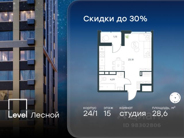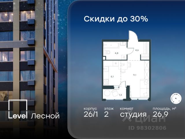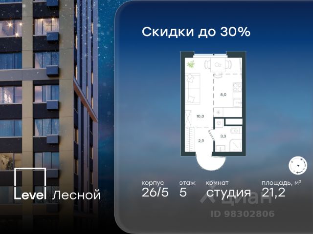 Цена указана с учётом скидки при 100%-й оплате, несубсидированной ипотеке, рассрочке (кроме программы "Рассрочка 0%"). В районе, утопающем в густой зелени лесов, многочисленных парков и скверов, продаётся студия площадью 26.90 кв.м с отделкой white box. Квартира расположена на 2 этаже в жилом комплексе комфорт-класса Level Лесной (компания Level Group/Левел групп). Отличная транспортная доступность: - 25 мин. пешком до станции метро "Пятницкое шоссе"; - 28 мин. на автобусе до станции метро и МЦД-2 "Волоколамская"; - 11 мин. на авто до МКАД; - 25 мин. на авто до ТТК. Продуманный архитектурный проект: - Концепция проекта Level Лесной от бюро СПИЧ; - Высотность комплекса до 15 этажей с уникальными видами на лесные массивы и город; - Высота потолков до 3 м; - Современные окна высотой до 1,6 м, в части квартир предусмотрены окна в пол. Высота подоконников 0,6 м; Расположение: Level Лесной строится в зелёной зоне ближайшего Подмосковья, г.о. Красногорск в посёлке Отрадное. Шаговая и автомобильная доступность до метро и больших транспортных артерий города. За 25 минут вы дойдёте до станции метро "Пятницкое шоссе", а за 20 минут на машине сможете доехать до станции метро "Тушинская". Район окружен роскошной зеленью лесов и парковых зон, занимающих территорию свыше 1 000 гектаров. Помимо благоприятной экологии, здесь множество возможностей для активного отдыха и поддержания физической формы. Облагороженная территории с полностью развитой инфраструктурой. На территории проекта находится детский сад и школа "Светлые Горы", которая входит в список лучших частных школ от Forbes Education (по данным на 2023г.). Кроме того, в пешей доступности расположено ещё 8 детских садов, а также запланировано открытие современной муниципальной школы. В непосредственной близости находятся сетевые супермаркеты и локальные магазины, аптеки, клиники, почта, библиотека, салоны красоты, рестораны, спортивные и творческие секции, развивающие детские центры. В 12 минутах пешком расположен торговый парк "Отрада" с продуктовым и строительным гипермаркетами, магазинами, кинотеатром и развлечениями для детей. Внутренняя инфраструктура: Мы знаем, как важно, чтобы магазины и сервисы были всегда рядом. В сданных корпусах Level Лесной уже расположена полностью готовая развитая инфраструктура. На первых этажах корпуса 27 предусмотрено ещё 14 коммерческих помещений. Благоустройство: Продуманное пространство и аура приватного европейского городка рождают чувство лёгкости и расслабления у каждого, кто попадает на территорию проекта. Концепцию общественных площадок разработали в партнёрстве два архитектурных бюро: Highlight Architecture и SCAPE. В безопасных дворах без машин каждый обязательно найдёт себе место для вдохновения, отдыха и спорта.