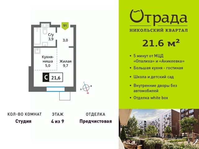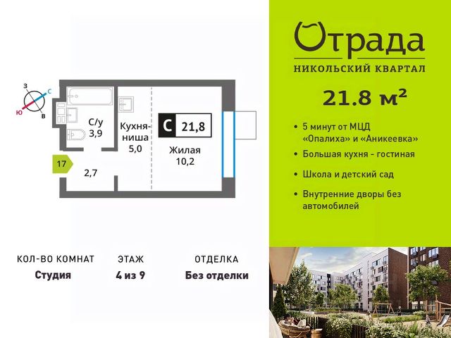 Квартира-студия с компактной кухней-нишей Квартира-студия с компактной кухней-нишей в жилом комплексе комфорт-класса "Никольский квартал Отрада". Планировка выполнена по современным стандартам и отличается повышенным комфортом. Квартал расположен в удачной локации, которая сочетает благоприятную экологическую обстановку с прекрасной транспортной доступностью. Проектом предусмотрены 14 корпусов высотой 6-9 этажей, а также муниципальная школа, один муниципальный и один частный детский сад, два наземных многоуровневых паркинга с кладовыми помещениями. Надежный застройщик ГК "Отрада" с высочайшим рейтингом 5 звезд от портала ЕРЗ. Все корпуса во всех ЖК сданы раньше срока! Купить квартиру-студию в микрорайоне Опалиха в городе Красногорск.