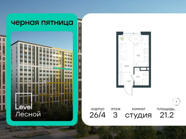 Цена указана с учётом скидки при 100%-й оплате, несубсидированной ипотеке, рассрочке (кроме программы "Рассрочка 0%"). Субсидированная семейная ипотека. Полная стоимость кредита 20,963 - 23,237% годовых. Ставка 3,9% годовых. Первоначальный взнос от 20,01%. Сумма кредита до 12 млн. руб. В районе, утопающем в густой зелени лесов, многочисленных парков и скверов, продаётся студия площадью 26.90 кв.м с отделкой white box. Квартира расположена на 2 этаже в жилом комплексе комфорт-класса Level Лесной (компания Level Group/Левел групп). Отличная транспортная доступность: - 25 мин. пешком до станции метро "Пятницкое шоссе"; - 28 мин. на автобусе до станции метро и МЦД-2 "Волоколамская"; - 11 мин. на авто до МКАД; - 25 мин. на авто до ТТК. Продуманный архитектурный проект: - Концепция проекта Level Лесной от бюро СПИЧ; - Высотность комплекса до 15 этажей с уникальными видами на лесные массивы и город; - Высота потолков до 3 м; - Современные окна высотой до 1,6 м, в части квартир предусмотрены окна в пол. Высота подоконников 0,6 м; Расположение: Level Лесной строится в зелёной зоне ближайшего Подмосковья, г.о. Красногорск в посёлке Отрадное. Шаговая и автомобильная доступность до метро и больших транспортных артерий города. За 25 минут вы дойдёте до станции метро "Пятницкое шоссе", а за 20 минут на машине сможете доехать до станции метро "Тушинская". Район окружен роскошной зеленью лесов и парковых зон, занимающих территорию свыше 1 000 гектаров. Помимо благоприятной экологии, здесь множество возможностей для активного отдыха и поддержания физической формы. Облагороженная территории с полностью развитой инфраструктурой. На территории проекта находится детский сад и школа "Светлые Горы", которая входит в список лучших частных школ от Forbes Education (по данным на 2023г.). Кроме того, в пешей доступности расположено ещё 8 детских садов, а также запланировано открытие современной муниципальной школы. В непосредственной близости находятся сетевые супермаркеты и локальные магазины, аптеки, клиники, почта, библиотека, салоны красоты, рестораны, спортивные и творческие секции, развивающие детские центры. В 12 минутах пешком расположен торговый парк "Отрада" с продуктовым и строительным гипермаркетами, магазинами, кинотеатром и развлечениями для детей. Внутренняя инфраструктура: Мы знаем, как важно, чтобы магазины и сервисы были всегда рядом. В сданных корпусах Level Лесной уже расположена полностью готовая развитая инфраструктура. На первых этажах корпуса 27 предусмотрено ещё 14 коммерческих помещений. Благоустройство: Продуманное пространство и аура приватного европейского городка рождают чувство лёгкости и расслабления у каждого, кто попадает на территорию проекта. Концепцию общественных площадок разработали в партнёрстве два архитектурных бюро: Highlight Architecture и SCAPE. В безопасных дворах без машин каждый обязательно найдёт себе место для вдохновения, отдыха и спорта.