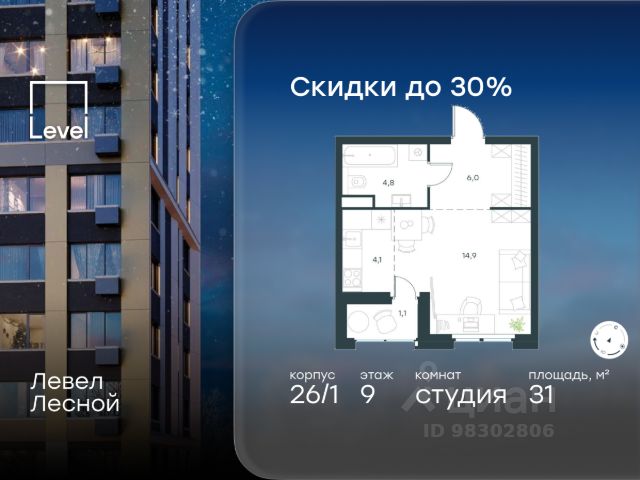 Цена указана с учётом скидки при 100%-й оплате, несубсидированной ипотеке, рассрочке (кроме программы "Рассрочка 0%"). В районе, утопающем в густой зелени лесов, многочисленных парков и скверов, продаётся студия площадью 26.90 кв.м с отделкой white box. Квартира расположена на 9 этаже в жилом комплексе комфорт-класса Левел Лесной (компания Level Group/Левел групп). Отличная транспортная доступность: - 25 мин. пешком до станции метро "Пятницкое шоссе"; - 28 мин. на автобусе до станции метро и МЦД-2 "Волоколамская"; - 11 мин. на авто до МКАД; - 25 мин. на авто до ТТК. Продуманный архитектурный проект: - Концепция проекта Левел Лесной от бюро СПИЧ; - Высотность комплекса до 15 этажей с уникальными видами на лесные массивы и город; - Высота потолков до 3 м; - Современные окна высотой до 1,6 м, в части квартир предусмотрены окна в пол. Высота подоконников 0,6 м; Расположение: Левел Лесной строится в зелёной зоне ближайшего Подмосковья, г.о. Красногорск в посёлке Отрадное. Шаговая и автомобильная доступность до метро и больших транспортных артерий города. За 25 минут вы дойдёте до станции метро "Пятницкое шоссе", а за 20 минут на машине сможете доехать до станции метро "Тушинская". Район окружен роскошной зеленью лесов и парковых зон, занимающих территорию свыше 1 000 гектаров. Помимо благоприятной экологии, здесь множество возможностей для активного отдыха и поддержания физической формы. Облагороженная территории с полностью развитой инфраструктурой. На территории проекта находится детский сад и школа "Светлые Горы", которая входит в список лучших частных школ от Forbes Education (по данным на 2023г.). Кроме того, в пешей доступности расположено ещё 8 детских садов, а также запланировано открытие современной муниципальной школы. В непосредственной близости находятся сетевые супермаркеты и локальные магазины, аптеки, клиники, почта, библиотека, салоны красоты, рестораны, спортивные и творческие секции, развивающие детские центры. В 12 минутах пешком расположен торговый парк "Отрада" с продуктовым и строительным гипермаркетами, магазинами, кинотеатром и развлечениями для детей. Внутренняя инфраструктура: Мы знаем, как важно, чтобы магазины и сервисы были всегда рядом. В сданных корпусах Левел Лесной уже расположена полностью готовая развитая инфраструктура. На первых этажах корпуса 27 предусмотрено ещё 14 коммерческих помещений. Благоустройство: Продуманное пространство и аура приватного европейского городка рождают чувство лёгкости и расслабления у каждого, кто попадает на территорию проекта. Концепцию общественных площадок разработали в партнёрстве два архитектурных бюро: Highlight Architecture и SCAPE. В безопасных дворах без машин каждый обязательно найдёт себе место для вдохновения, отдыха и спорта.