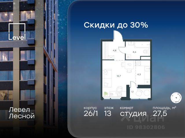 Цена указана с учётом скидки при 100%-й оплате, несубсидированной ипотеке, рассрочке (кроме программы "Рассрочка 0%"). В районе, утопающем в густой зелени лесов, многочисленных парков и скверов, продаётся студия площадью 27.50 кв.м с отделкой white box. Квартира расположена на 13 этаже в жилом комплексе комфорт-класса Левел Лесной (компания Level Group/Левел групп). Отличная транспортная доступность: - 25 мин. пешком до станции метро "Пятницкое шоссе"; - 28 мин. на автобусе до станции метро и МЦД-2 "Волоколамская"; - 11 мин. на авто до МКАД; - 25 мин. на авто до ТТК. Продуманный архитектурный проект: - Концепция проекта Левел Лесной от бюро СПИЧ; - Высотность комплекса до 15 этажей с уникальными видами на лесные массивы и город; - Высота потолков до 3 м; - Современные окна высотой до 1,6 м, в части квартир предусмотрены окна в пол. Высота подоконников 0,6 м; Расположение: Левел Лесной строится в зелёной зоне ближайшего Подмосковья, г.о. Красногорск в посёлке Отрадное. Шаговая и автомобильная доступность до метро и больших транспортных артерий города. За 25 минут вы дойдёте до станции метро "Пятницкое шоссе", а за 20 минут на машине сможете доехать до станции метро "Тушинская". Район окружен роскошной зеленью лесов и парковых зон, занимающих территорию свыше 1 000 гектаров. Помимо благоприятной экологии, здесь множество возможностей для активного отдыха и поддержания физической формы. Облагороженная территории с полностью развитой инфраструктурой. На территории проекта находится детский сад и школа "Светлые Горы", которая входит в список лучших частных школ от Forbes Education (по данным на 2023г.). Кроме того, в пешей доступности расположено ещё 8 детских садов, а также запланировано открытие современной муниципальной школы. В непосредственной близости находятся сетевые супермаркеты и локальные магазины, аптеки, клиники, почта, библиотека, салоны красоты, рестораны, спортивные и творческие секции, развивающие детские центры. В 12 минутах пешком расположен торговый парк "Отрада" с продуктовым и строительным гипермаркетами, магазинами, кинотеатром и развлечениями для детей. Внутренняя инфраструктура: Мы знаем, как важно, чтобы магазины и сервисы были всегда рядом. В сданных корпусах Левел Лесной уже расположена полностью готовая развитая инфраструктура. На первых этажах корпуса 27 предусмотрено ещё 14 коммерческих помещений. Благоустройство: Продуманное пространство и аура приватного европейского городка рождают чувство лёгкости и расслабления у каждого, кто попадает на территорию проекта. Концепцию общественных площадок разработали в партнёрстве два архитектурных бюро: Highlight Architecture и SCAPE. В безопасных дворах без машин каждый обязательно найдёт себе место для вдохновения, отдыха и спорта.