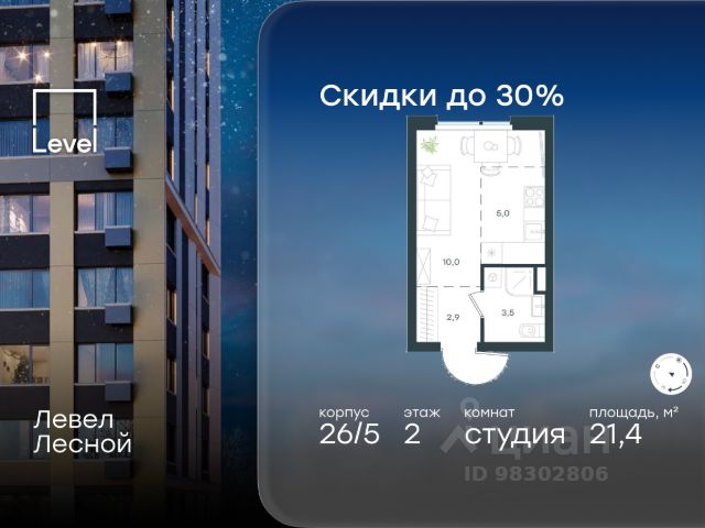 Цена указана с учётом скидки при 100%-й оплате, несубсидированной ипотеке, рассрочке (кроме программы "Рассрочка 0%"). В районе, утопающем в густой зелени лесов, многочисленных парков и скверов, продаётся студия площадью 21.40 кв.м с отделкой white box. Квартира расположена на 2 этаже в жилом комплексе комфорт-класса Левел Лесной (компания Level Group/Левел групп). Отличная транспортная доступность: - 25 мин. пешком до станции метро "Пятницкое шоссе"; - 28 мин. на автобусе до станции метро и МЦД-2 "Волоколамская"; - 11 мин. на авто до МКАД; - 25 мин. на авто до ТТК. Продуманный архитектурный проект: - Концепция проекта Левел Лесной от бюро СПИЧ; - Высотность комплекса до 15 этажей с уникальными видами на лесные массивы и город; - Высота потолков до 3 м; - Современные окна высотой до 1,6 м, в части квартир предусмотрены окна в пол. Высота подоконников 0,6 м; Расположение: Левел Лесной строится в зелёной зоне ближайшего Подмосковья, г.о. Красногорск в посёлке Отрадное. Шаговая и автомобильная доступность до метро и больших транспортных артерий города. За 25 минут вы дойдёте до станции метро "Пятницкое шоссе", а за 20 минут на машине сможете доехать до станции метро "Тушинская". Район окружен роскошной зеленью лесов и парковых зон, занимающих территорию свыше 1 000 гектаров. Помимо благоприятной экологии, здесь множество возможностей для активного отдыха и поддержания физической формы. Облагороженная территории с полностью развитой инфраструктурой. На территории проекта находится детский сад и школа "Светлые Горы", которая входит в список лучших частных школ от Forbes Education (по данным на 2023г.). Кроме того, в пешей доступности расположено ещё 8 детских садов, а также запланировано открытие современной муниципальной школы. В непосредственной близости находятся сетевые супермаркеты и локальные магазины, аптеки, клиники, почта, библиотека, салоны красоты, рестораны, спортивные и творческие секции, развивающие детские центры. В 12 минутах пешком расположен торговый парк "Отрада" с продуктовым и строительным гипермаркетами, магазинами, кинотеатром и развлечениями для детей. Внутренняя инфраструктура: Мы знаем, как важно, чтобы магазины и сервисы были всегда рядом. В сданных корпусах Левел Лесной уже расположена полностью готовая развитая инфраструктура. На первых этажах корпуса 27 предусмотрено ещё 14 коммерческих помещений. Благоустройство: Продуманное пространство и аура приватного европейского городка рождают чувство лёгкости и расслабления у каждого, кто попадает на территорию проекта. Концепцию общественных площадок разработали в партнёрстве два архитектурных бюро: Highlight Architecture и SCAPE. В безопасных дворах без машин каждый обязательно найдёт себе место для вдохновения, отдыха и спорта.