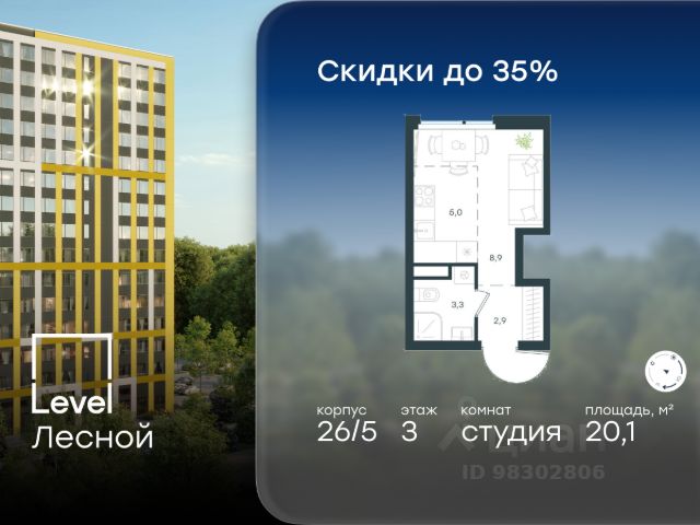 Цена указана с учётом скидки при 100%-й оплате, несубсидированной ипотеке, рассрочке (кроме программы "Рассрочка 0%"). В районе, утопающем в густой зелени лесов, многочисленных парков и скверов, продаётся студия площадью 26.90 кв.м с отделкой white box. Квартира расположена на 2 этаже в жилом комплексе комфорт-класса Level Лесной (компания Level Group/Левел групп). Отличная транспортная доступность: - 25 мин. пешком до станции метро "Пятницкое шоссе"; - 28 мин. на автобусе до станции метро и МЦД-2 "Волоколамская"; - 11 мин. на авто до МКАД; - 25 мин. на авто до ТТК. Продуманный архитектурный проект: - Концепция проекта Level Лесной от бюро СПИЧ; - Высотность комплекса до 15 этажей с уникальными видами на лесные массивы и город; - Высота потолков до 3 м; - Современные окна высотой до 1,6 м, в части квартир предусмотрены окна в пол. Высота подоконников 0,6 м; Расположение: Level Лесной строится в зелёной зоне ближайшего Подмосковья, г.о. Красногорск в посёлке Отрадное. Шаговая и автомобильная доступность до метро и больших транспортных артерий города. За 25 минут вы дойдёте до станции метро "Пятницкое шоссе", а за 20 минут на машине сможете доехать до станции метро "Тушинская". Район окружен роскошной зеленью лесов и парковых зон, занимающих территорию свыше 1 000 гектаров. Помимо благоприятной экологии, здесь множество возможностей для активного отдыха и поддержания физической формы. Облагороженная территории с полностью развитой инфраструктурой. На территории проекта находится детский сад и школа "Светлые Горы", которая входит в список лучших частных школ от Forbes Education (по данным на 2023г.). Кроме того, в пешей доступности расположено ещё 8 детских садов, а также запланировано открытие современной муниципальной школы. В непосредственной близости находятся сетевые супермаркеты и локальные магазины, аптеки, клиники, почта, библиотека, салоны красоты, рестораны, спортивные и творческие секции, развивающие детские центры. В 12 минутах пешком расположен торговый парк "Отрада" с продуктовым и строительным гипермаркетами, магазинами, кинотеатром и развлечениями для детей. Внутренняя инфраструктура: Мы знаем, как важно, чтобы магазины и сервисы были всегда рядом. В сданных корпусах Level Лесной уже расположена полностью готовая развитая инфраструктура. На первых этажах корпуса 27 предусмотрено ещё 14 коммерческих помещений. Благоустройство: Продуманное пространство и аура приватного европейского городка рождают чувство лёгкости и расслабления у каждого, кто попадает на территорию проекта. Концепцию общественных площадок разработали в партнёрстве два архитектурных бюро: Highlight Architecture и SCAPE. В безопасных дворах без машин каждый обязательно найдёт себе место для вдохновения, отдыха и спорта.