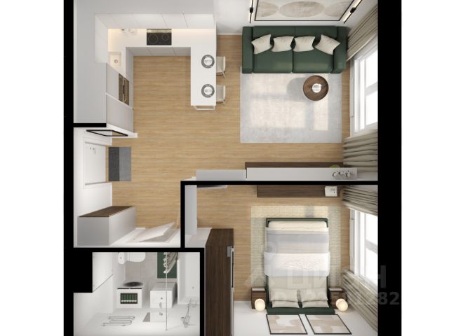 Из окон, а также с балкона, открывается вид во двор. В квартире предусмотрен отдельный рабочий кабинет. В квартире высокие потолки 3.25 м, что дает ощущение простора. Преимуществом также является большой санузел, а ещё предусмотрена постирочная.