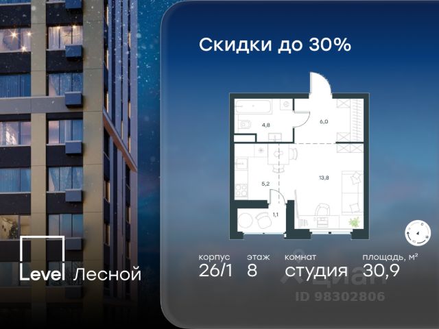 Цена указана с учётом скидки при 100%-й оплате, несубсидированной ипотеке, рассрочке (кроме программы "Рассрочка 0%"). В районе, утопающем в густой зелени лесов, многочисленных парков и скверов, продаётся студия площадью 28.60 кв.м без отделки. Квартира расположена на 15 этаже в жилом комплексе комфорт-класса Level Лесной (компания Level Group/Левел групп). Отличная транспортная доступность: - 25 мин. пешком до станции метро "Пятницкое шоссе"; - 28 мин. на автобусе до станции метро и МЦД-2 "Волоколамская"; - 11 мин. на авто до МКАД; - 25 мин. на авто до ТТК. Продуманный архитектурный проект: - Концепция проекта Level Лесной от бюро СПИЧ; - Высотность комплекса до 15 этажей с уникальными видами на лесные массивы и город; - Высота потолков до 3 м; - Современные окна высотой до 1,6 м, в части квартир предусмотрены окна в пол. Высота подоконников 0,6 м; Расположение: Level Лесной строится в зелёной зоне ближайшего Подмосковья, г.о. Красногорск в посёлке Отрадное. Шаговая и автомобильная доступность до метро и больших транспортных артерий города. За 25 минут вы дойдёте до станции метро "Пятницкое шоссе", а за 20 минут на машине сможете доехать до станции метро "Тушинская". Район окружен роскошной зеленью лесов и парковых зон, занимающих территорию свыше 1 000 гектаров. Помимо благоприятной экологии, здесь множество возможностей для активного отдыха и поддержания физической формы. Облагороженная территории с полностью развитой инфраструктурой. На территории проекта находится детский сад и школа "Светлые Горы", которая входит в список лучших частных школ от Forbes Education (по данным на 2023г.). Кроме того, в пешей доступности расположено ещё 8 детских садов, а также запланировано открытие современной муниципальной школы. В непосредственной близости находятся сетевые супермаркеты и локальные магазины, аптеки, клиники, почта, библиотека, салоны красоты, рестораны, спортивные и творческие секции, развивающие детские центры. В 12 минутах пешком расположен торговый парк "Отрада" с продуктовым и строительным гипермаркетами, магазинами, кинотеатром и развлечениями для детей. Внутренняя инфраструктура: Мы знаем, как важно, чтобы магазины и сервисы были всегда рядом. В сданных корпусах Level Лесной уже расположена полностью готовая развитая инфраструктура. На первых этажах корпуса 27 предусмотрено ещё 14 коммерческих помещений. Благоустройство: Продуманное пространство и аура приватного европейского городка рождают чувство лёгкости и расслабления у каждого, кто попадает на территорию проекта. Концепцию общественных площадок разработали в партнёрстве два архитектурных бюро: Highlight Architecture и SCAPE. В безопасных дворах без машин каждый обязательно найдёт себе место для вдохновения, отдыха и спорта.