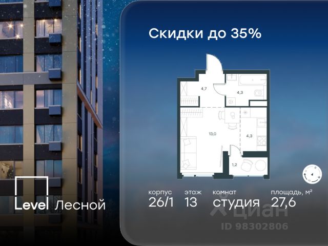 В районе, утопающем в густой зелени лесов, многочисленных парков и скверов, продаётся студия площадью 26.90 кв.м с отделкой white box. Квартира расположена на 2 этаже в жилом комплексе комфорт-класса Level Лесной (компания Level Group/Левел групп).