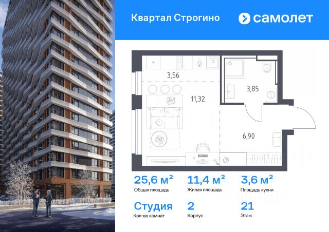 — Площадь квартиры 25,7 м2, жилая 11,4 м2, кухня-ниша 3.6 м2, С/У 3,9 м2;