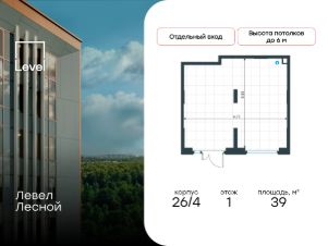 Продаётся коммерческое помещение свободного назначения площадью 39.00 м² в корпусе 1 дома 26 строящегося жилого комплекса комфорт-класса Левел Лесной. Сдача дома 26 запланирована на III квартал 2027 г. Проект расположен в зелёной зо...