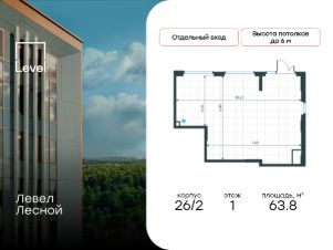 Продаётся коммерческое помещение свободного назначения площадью 63.80 м² в корпусе 1 дома 26 строящегося жилого комплекса комфорт-класса Левел Лесной. Сдача дома 26 запланирована на III квартал 2027 г. Проект расположен в зелёной зо...