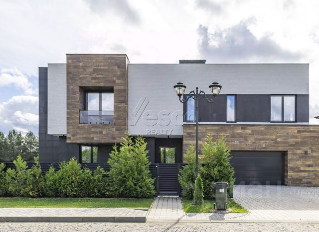 ID 10491 Дом в современном стиле площадью 440 кв.м. на участке 23 сотки с ландшафтом и прекрасным панорамным видом на лесной массив. В доме выполнен дизайнерский ремонт, отделка класса люкс. Полы в прихожей, гостиной, два санузла и камин выполнены из натурального камня, привезенного из Италии мрамора и травертина. Паркет от итальянской фабрики IPF, керамогранит от итальянского премиумпроизводителя Fiandre. Раздвижные двери и стеновые панели от итальянской премиальной фабрики LONGHI. Сантехника топовых брендов: HIPPE, Cielo, Gessi, Bisazza, Antonio Lupi, Duravit, Ideal Standard. Кухня фабрики Mittel. Фасад отделан натуральным камнем, дорогие окна, натуральная черепица. 1 этаж - прихожая с гардеробом, ванная комната, гостиная с панорамным остеклением, столовая выходом на участок, кухня с панорамными окнами и выходом на участок; 2 этаж - холл, хозяйская спальня с ванной комнатой и гардеробной, 2 спальни с ванной комнатой и гардеробной, гостиная зона с камином.