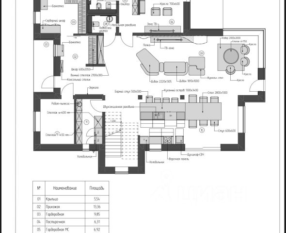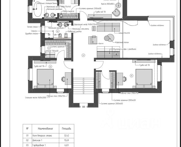 Общие помещения: прихожая (11,1), гардеробная (7,2), холл (28), каминный зал (45), столовая (29), кухня (22,1) с выходом на террасу (22,3), гостиная (74,4) с выходом на террасу (9,8), кабинет (12,8) с кладовой (1,5), гостевой с/у (1,5), зона спа с бочкой (10,5), сауна (6,9) с душевой (2,3), гараж на 3 м/м (71,3).