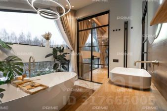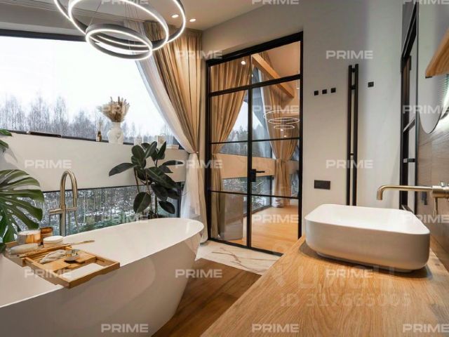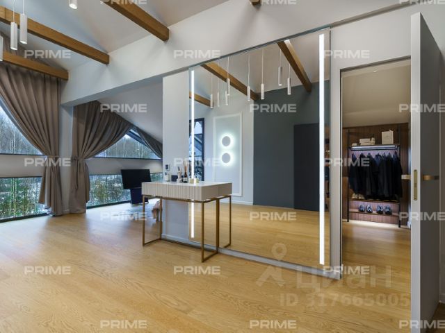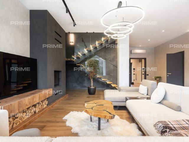 В доме: 3 спальни, холл с парадной винтовой лестницей и панорамными окнами высотой 9,1 м (тройной свет), кухня-столовая с выходом на террасу, гостиная с круговым дровяным камином в центре зала, кинотеатр с бильярдной, спа зона с сауной и хаммамом, спортивный зал на третьем этаже с панорамным видом на участок, постирочная, гараж на 2 машиноместа.