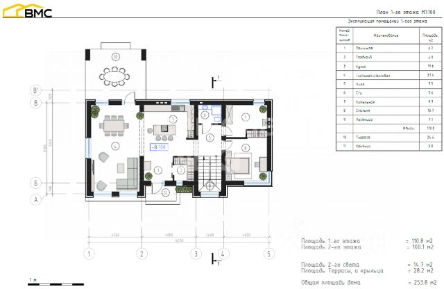 1-ый этаж: кухня/столовая 52,6 м², спальня/кабинет 15,3 м², с/у 4,4 м², котельная/постирочная 6,6 м², прихожая/гардеробная 15 м², холл 11,1 м², крыльцо 5,5 м², терраса 34,5 м², парковка 22,5 м²