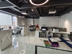 В помещении выполнен дизайнерский ремонт из качественных отделочных материалов, на полу керамогранит, потолки в открытом стиле окрашены в темные оттенки серого, во всех помещениях установлено современное светодиодное освещение,  выполнена качественная разводка слаботочных и силовых систем, установлены противопожарные системы. Стеклянные перегородки премиум класса из закаленного стекла.
