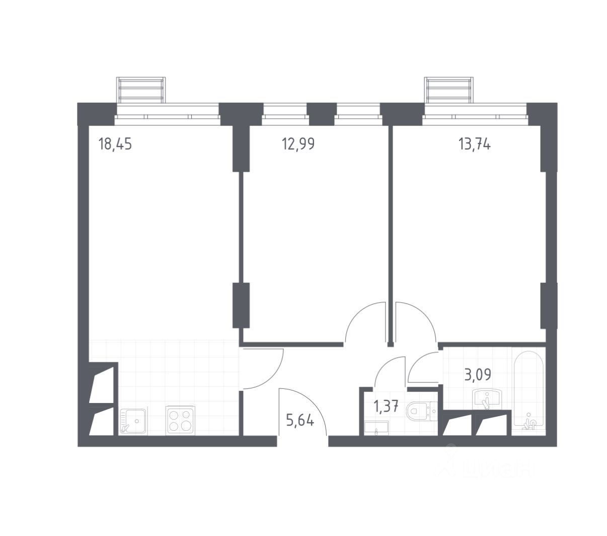 • Общая площадь55,2 м²