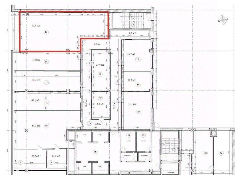 Центральные коммуникации, санузлы на этажах.