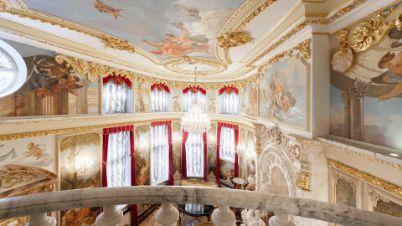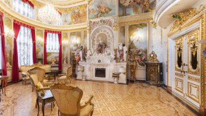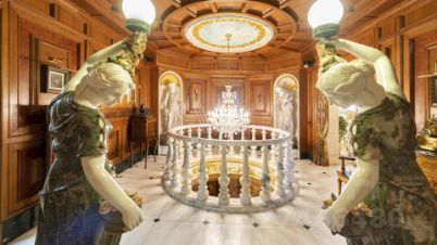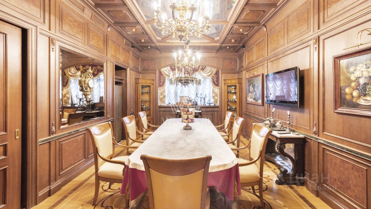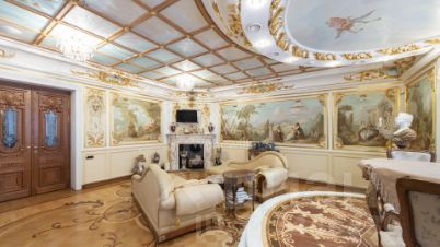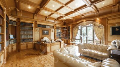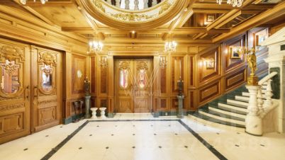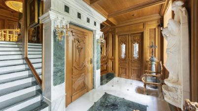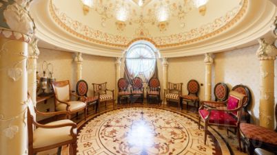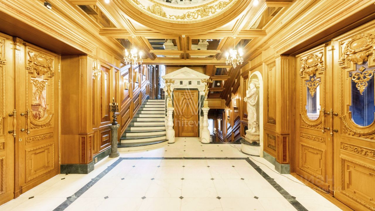 Трехэтажная усадьба с цоколем в коттеджном посёлке Береста. Здание 2012 года постройки, фасад выполнен в светло-голубом цвете, украшен барельефом, рустом и балюстрадой. Внутри смешанная планировка, выполнен качественный дизайнерский ремонт в стиле барокко, высота потолков от 2,8 до 8 метров. На цокольном этаже расположена зона отдыха с бассейном, сауной, бильярдом и кинотеатром. На 1-м этаже большая гостиная, кухня и технические помещения, на 2-м и 3-м этажах предусмотрены четыре спальни и одна мастер-спальня, библиотека и кабинет. Пламя настоящего дровяного камина добавляет дому уюта. На собственной огороженной территории и в гараже предусмотрено 10 парковочных мест. На облагороженном и озелененном дворе располагаются статуи и два фонтана. Особняк подходит для жизни.