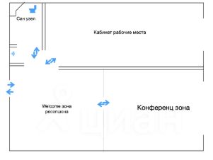* Первая комната:велком-зона + ресепшен + конференц-пространство (зонирование перегородкой)