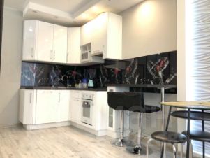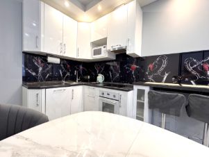 - электрическая плита, духовка, микроволновка, вытяжка, чайник, кофемашина, посудомоечная машина, холодильник;