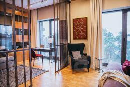 Квартира светлая, с большими окнами в пол выходящими на юго-запад. Из окон и террасы открываются панорамные виды на 2 стороны, на Москву-реку, на зеленые кроны деревьев и благоустроенную территорию квартала. Полная приватность, ощущение умиротворенности в окружении природы. В тоже время, удобная доступность к городу, 1 км до Новорижского ш.