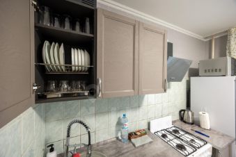 На кухне: кухонный гарнитур, газовая плита, холодильник, микроволновая печь, вытяжка, посуда и приборы на 6 персон, электрический чайник, кастрюли, сковорода, средства для мытья посуды, стол, стулья.
